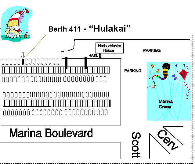 If you find a close spot and are already parked, you can get to our boat by going directly west through the gate at the Harbor office entrance (tell them you are sailing with us and they will buzz you in), take one of the two ramps going down on the left, continue west along the docks until Berth 411 per the drawing below. Our boat is named: "Hulakai" (Hawaiian for Sea Dancer).In case of problems, call our cell phones.