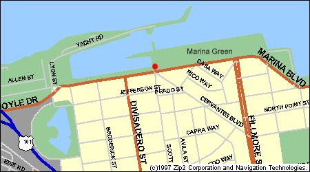 Our boat is close to the intersection of three streets at the northmost part of San Francisco: Marina Blvd, Cervantes and Scott. It is immediately next to Marina Park, where they fly kites. There is a small house there with flags flying and a sign on top of the house saying: "Harbor Office" and a phone number. There is lots of parking around there but on weekends, don't park in spaces with a red stripe. If only red striped spaces are available, that's OK -- just go into the harbor office and ask for a one day pass because you are sailing. Call Alex's cell phone if you have problems or to tell me you have arrived.
